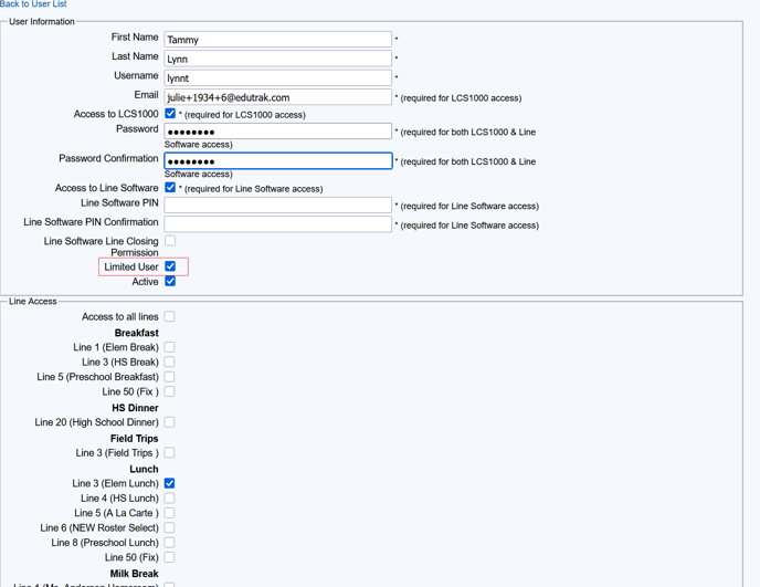 Restrict a user’s access to only reports and their assigned serving line by setting them as a Limited User