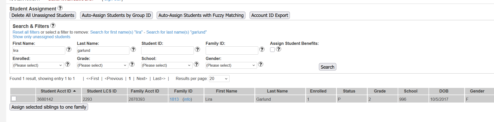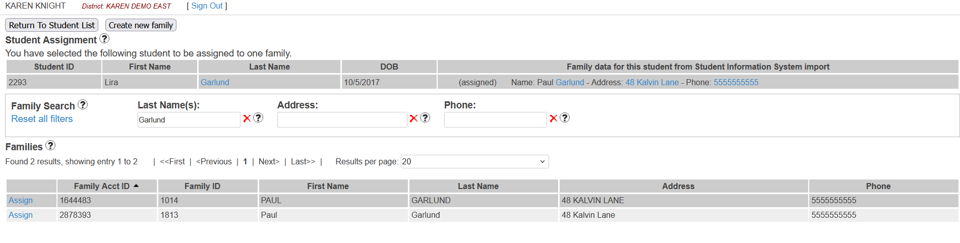 - Click the “Enter” button on your keyboard to search; then click the “Assign” link to assign the student to correct family.