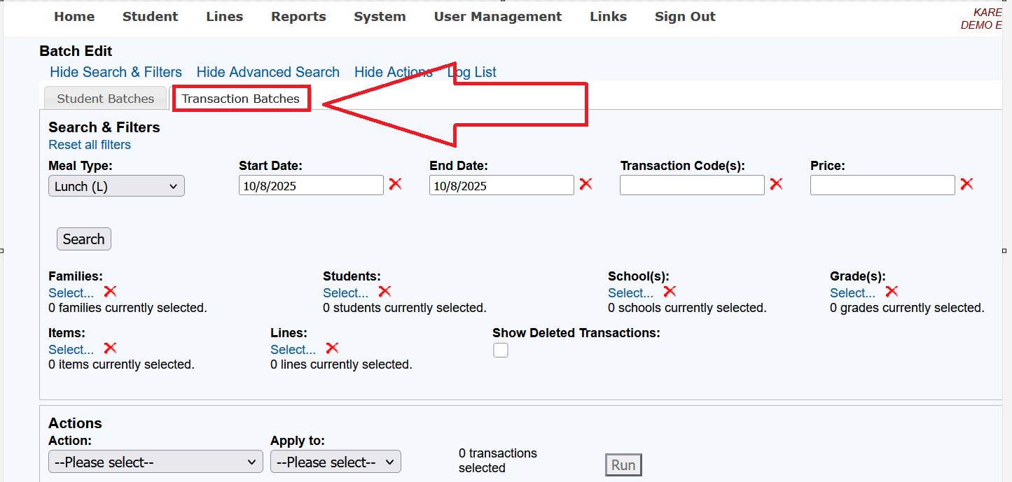 - From the LCS1000/ESC, under the Students tab, go to Batch Edit>Transaction Batches.