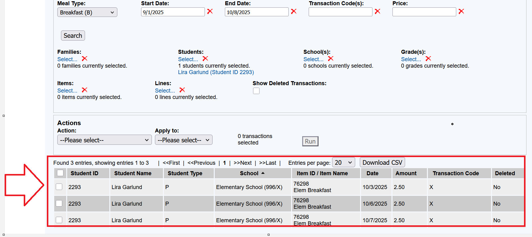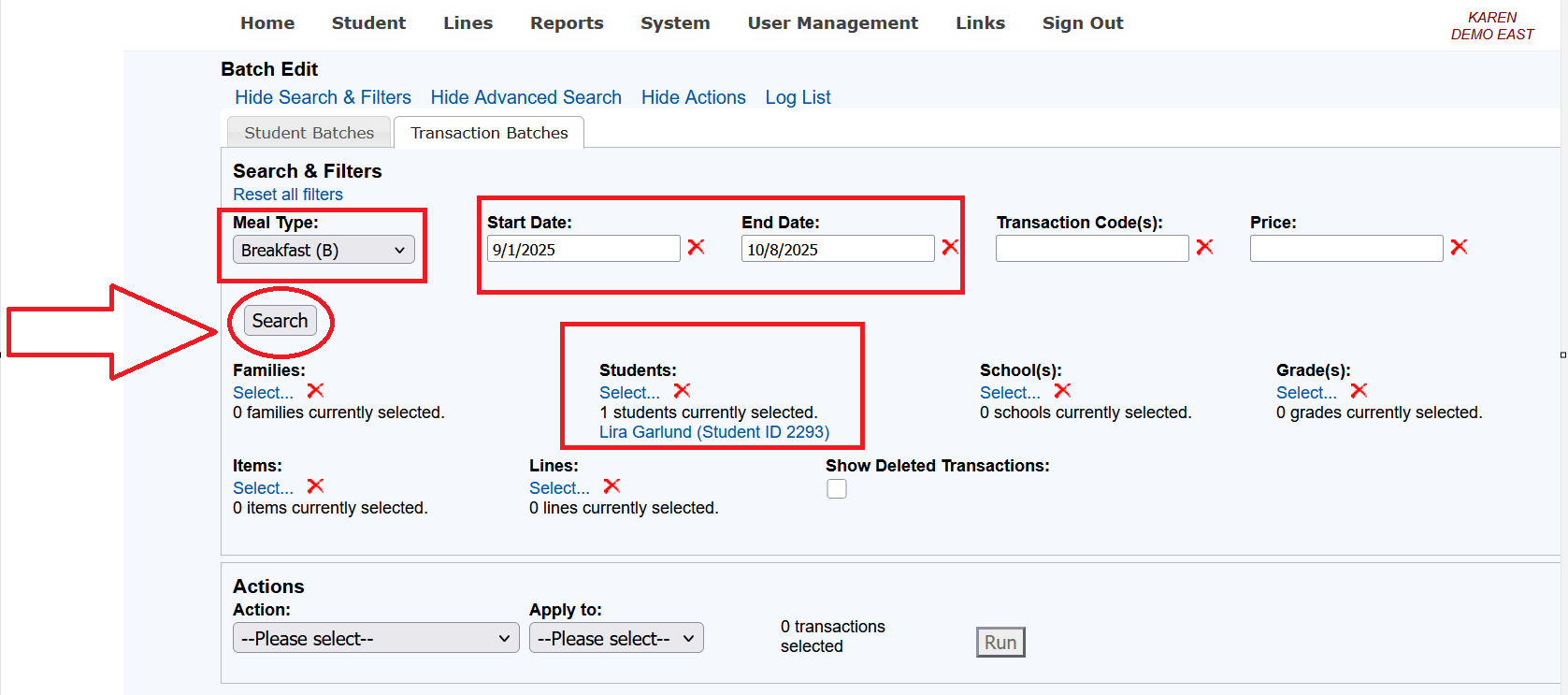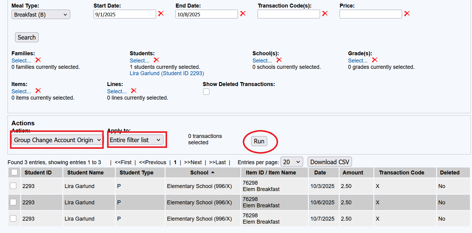 - Search for the transactions that need to be moved by entering the appropriate dates and selecting the student(s) under Students/select.
