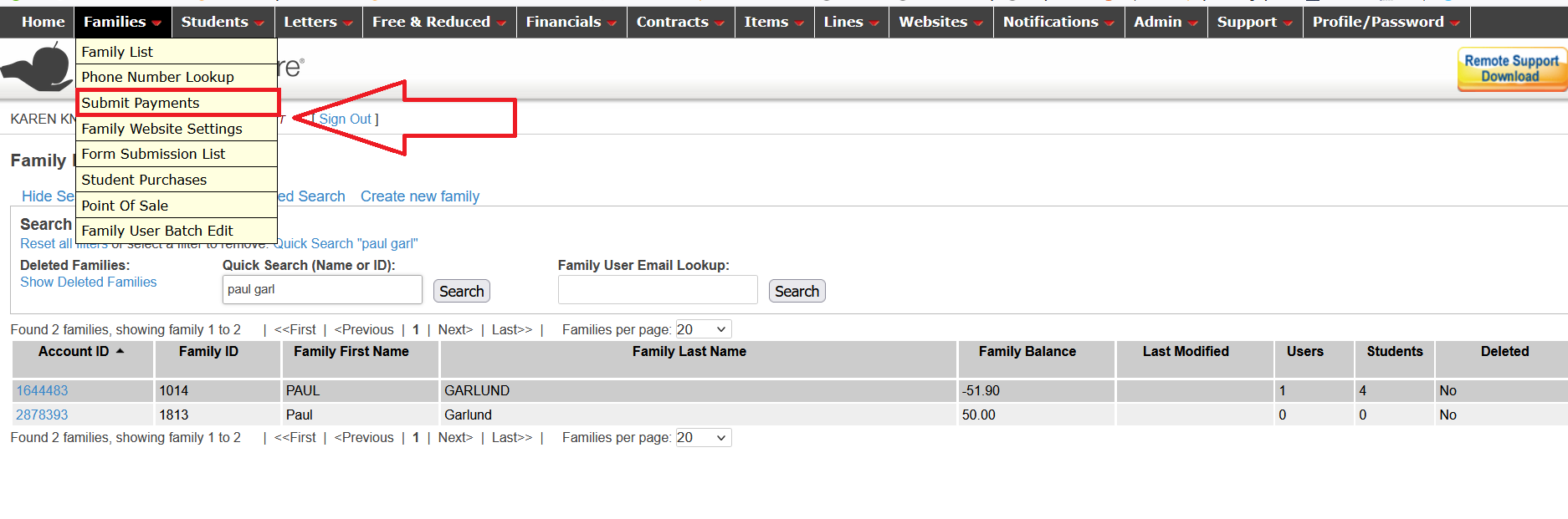 - In the Admin Site, under the Families tab, drop down to Submit Payments.