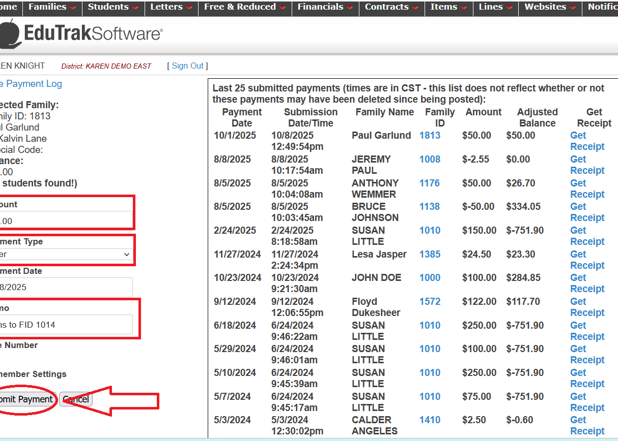 - Next, search for the family you want to move the money to. Enter a payment for the amount you are moving. For this example, you would enter 50.00. (If you are moving a negative balance to this account, you would enter a negative amount here.)