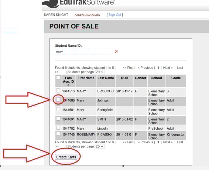 Next, search for one of the students in the family, as seen here. (Note, for food service payments, all students in the family eat out of the same shared family balance.)