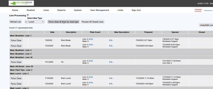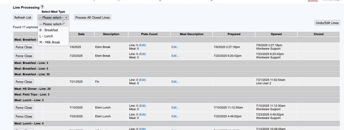 **** You can now proceed to process all closed lines for that meal type.