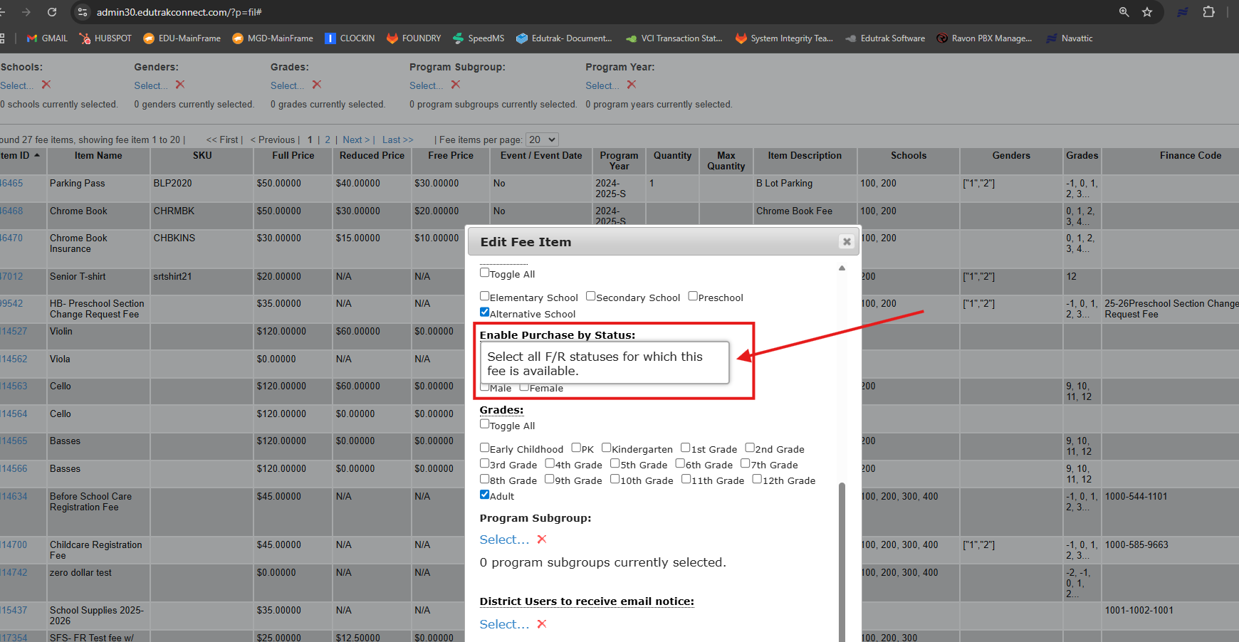 4. Scroll to 'Enable Purchase by Status'- check the status for the group you are allowing to purchase the fee